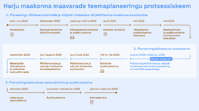 Teemaplaneeringu eskiislahendus koos seletuskirja ja mõjude hindamise aruande eelnõuga avalikustatakse 2025. aasta kevadel. Avaliku väljapaneku ajal on 30 päeva jooksul igaühel võimalik esitada kirjalikke arvamusi ja ettepanekuid. Samuti toimuvad avalikud arutelud, mille toimumisaegadest aegsasti teavitame.