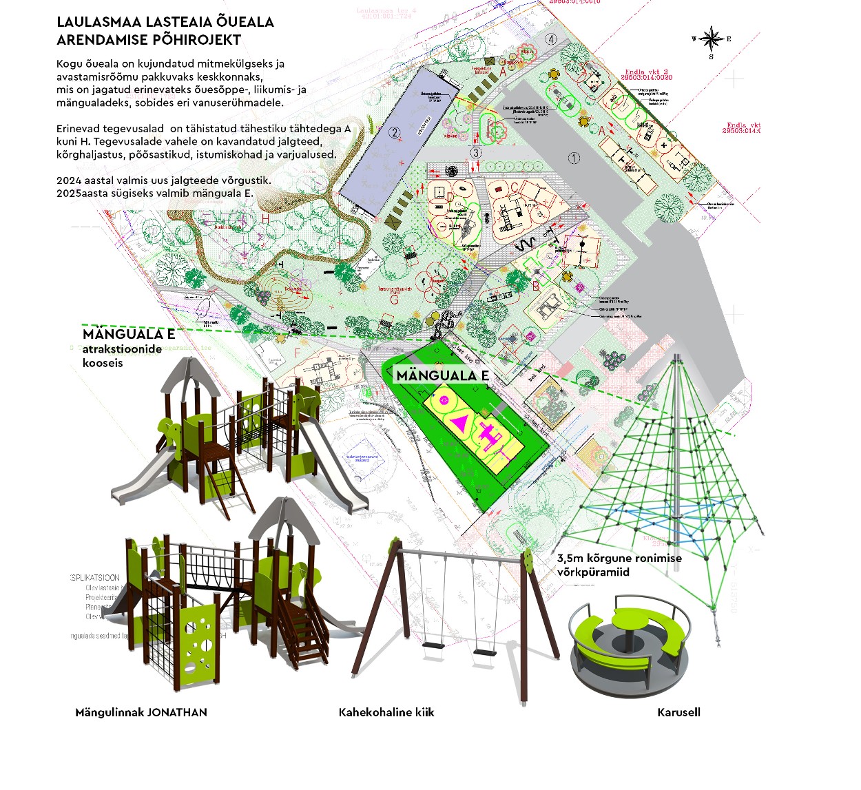 Lisatud fotol on õueala põhiprojekti joonis, kus on esile toodud rajatav E ala ja sellele alale paigaldatavad mänguatraktsioonid.