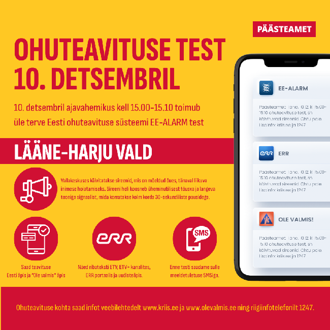 10. detsembril toimub üleriigiline ohuteavituse test RUS versioon ENG versioon Päästeamet testib kolmapäeval, 10. detsembril ohuteavituse süsteemi EE-ALARM....